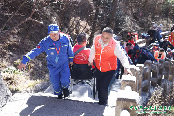 为积极做好这次公益活动的服务,景区提前部署相关工作,各部门、各单位全力支持配合,迎客松党支部、综治、公安、防火、票房、索道、宾馆等部门的工作人员以及迎客松志愿者积极参与,他们提前到岗到位,热情讲解、推扶轮椅、指引路线、适时开辟绿色通道,维护现场秩序,为“轮友”们保驾护航,用行动传递温暖与关爱。