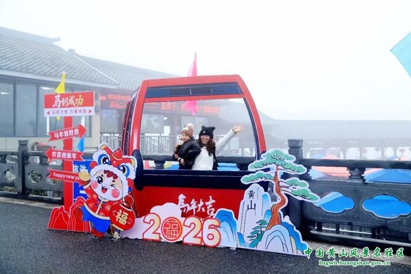 迎客松广场旁人头攒动,披上银装的千年迎客松苍劲挺拔,翠绿的松针被冰晶裹住。在新春第一天,众多游客排队等候在护栏前,以这棵“国宝”松树为背景合影留念。有人举起自拍杆将全家框进取景器,有人调整角度为父母单独留影,快门声此起彼伏。