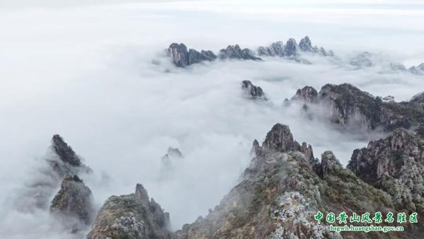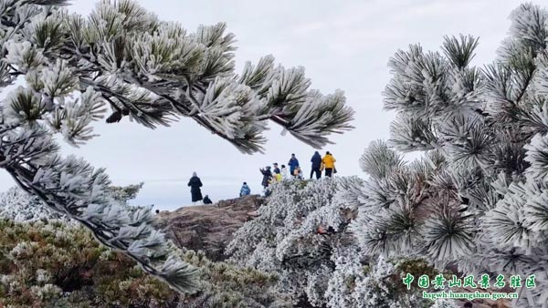 清晨,受低温及充足水汽的影响,在玉屏峰、始信峰、光明顶等地,大片灌木和奇松的枝头上挂满晶莹的冰凌。放眼望去,群峰覆玉,万松戴银,构成一幅层次分明的山水画卷。