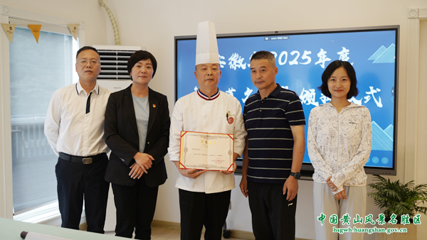 近日,黄山风景区排云型旅酒店行政总厨疏雪荣凭借在徽菜技艺传承、创新发展及人才培养领域的突出贡献,荣获安徽省人社厅颁发的“徽菜名厨”称号。
