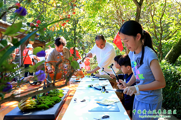 假日的黄山,不仅让游客尽览诗意秋色,更可投身多姿多彩的民俗活动,感受传统文化的独特风采。上午十点,在雲亼·曙光里,游客围桌而坐,揉团、包馅、压模……一个个承载节日祝福的月饼逐渐成形,空气中弥漫着诱人香气,传递着亲手制作的乐趣与温馨。捶花印草体验区同样备受青睐,游客们持槌轻敲,让花草脉络清晰印于布料,感受自然与艺术的交融。活动现场欢声笑语不断,每一个瞬间都成为节日里温暖而美好的回忆。