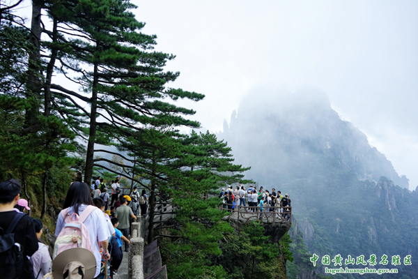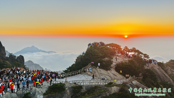 十月的黄山,天朗气清、云海翻腾,微带凉意的秋风拂过一面面鲜艳的五星红旗,漫山青翠已在悄然间开始了色彩的变换,来自五湖四海近23万名游客漫步黄山之巅度假赏景,尽享祖国山河壮美。