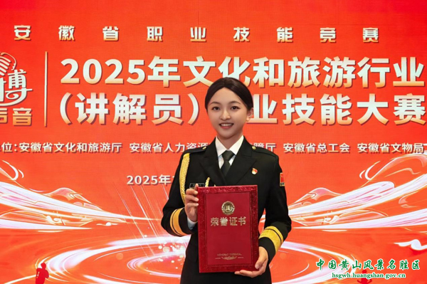 12月18日上午,由安徽省文化和旅游厅(安徽省文物局)、安徽省人力资源和社会保障厅、安徽省总工会联合主办的2025年文化和旅游行业(讲解员)职业技能大赛在芜湖圆满落幕。黄山风景区选派2名讲解员代表黄山市参赛,其中华山宾馆选手吴纯荣获志愿组二等奖,充分展现出景区讲解队伍的过硬专业素养与良好精神风貌。