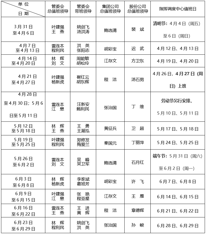 黄山风景区管委会领导全周值日安排表(2025年3月31日至2025年6月29日)