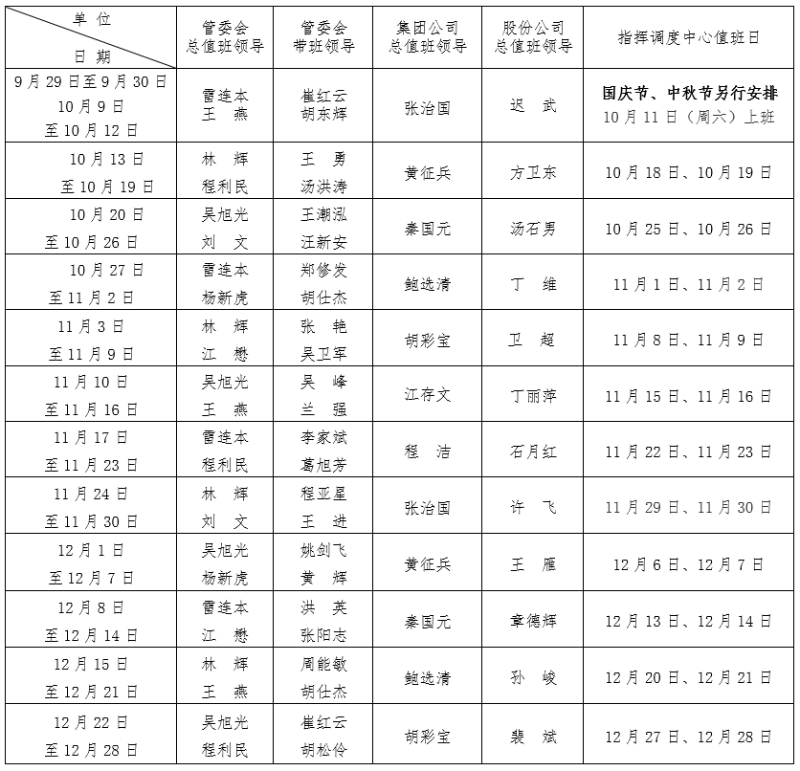 黄山风景区管委会领导全周值日安排表(2025年9月29日至2025年12月28日)