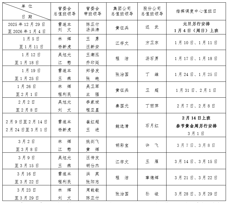 黄山风景区管委会领导全周值日安排表(2025年12月29日至2026年3月29日)