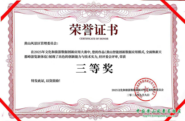 9月9日,由文化和旅游部科技教育司指导,中国文化传媒集团、中电信文宣科技有限公司联合主办的“数据赋能 乘数而上”2025文化和旅游数据创新应用大赛颁奖大会在北京举行。黄山风景区管委会、黄山旅游发展股份有限公司和中国电信黄山分公司共同建设并申报的“黄山智能创新数据应用,全面焕新天都峰游览体验”实践案例荣获三等奖。