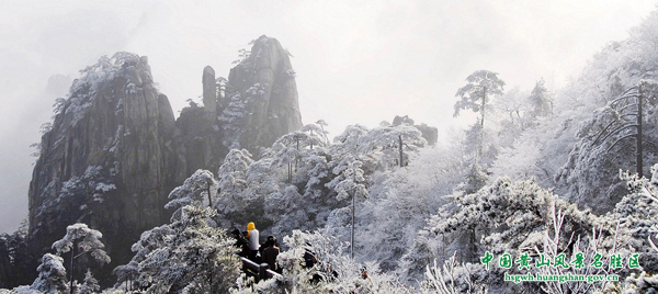 冬雪 黄山四季皆胜景,唯有腊冬景更佳。黄山冬雪,奇丽动人,可谓“南国里的北国风光”。纷纷扬扬的雪花,给黄山装扮一新,千沟万壑都接受冰雪的洗礼,溪瀑冰封,白絮遍铺,仿佛是一个银梦世界。古松枝杈上,险峰峻崖间,垂挂着一条条象钟乳石一样的冰柱。峰脊、石背和梯道,如同冰雕雪琢,遍山的花草竹林,犹如银枝玉叶。