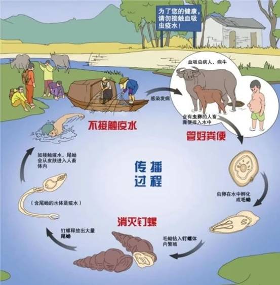 感染了血吸虫的人或其他哺乳动物从粪便中排出虫卵,虫卵在水中孵化出毛蚴并侵入钉螺体内,发育成熟后从钉螺体内释放出尾蚴进入水体,人接触含有血吸虫尾蚴的“疫水”,只要10秒就可被感染。
