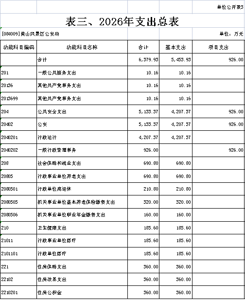黄山风景区公安局2026年单位预算表由14张表格构成,具体内容如下。