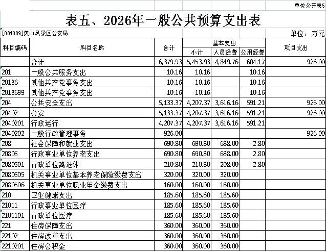 5.住房保障支出(类)住房改革支出(款)住房公积金(项)2026年预算360330万元,比2025年预算增长30万元,增幅9.09%,增长原因主要是2026年度黄山风景区公安局实有各类人员有所增加。