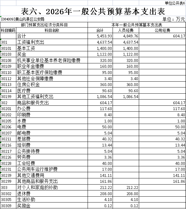 6.黄山风景区公安局2026年一般公共预算基本支出表