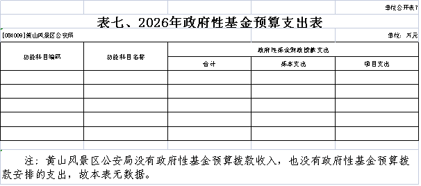 黄山风景区公安局2026年没有政府性基金预算拨款收入,也没有使用政府性基金预算拨款安排的支出。