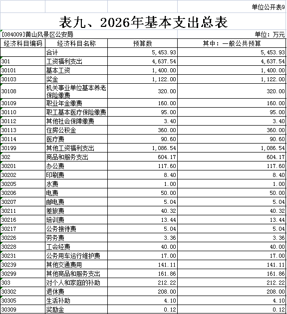 黄山风景区公安局2026年一般公共预算基本支出5453.93万元,其中:人员经费4849.76万元,公用经费604.17万元。
