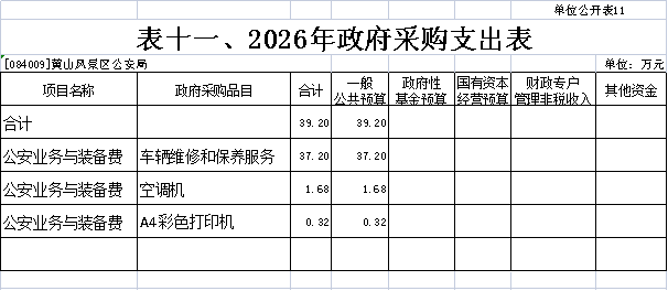 黄山风景区公安局2026年单位政府采购预算总额39.20万元。其中:政府采购货物预算39.20万元,政府采购工程预算0万元,政府采购服务预算0万元。